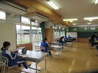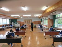 令和5年度の全国学力学習状況調査の英語「話すこと」の調査が本日、3年生対象に実施されました。問題は個々のタブレットで配信され、生徒はヘッドセットを装着して、マイクにしゃべる方式で解答しました。